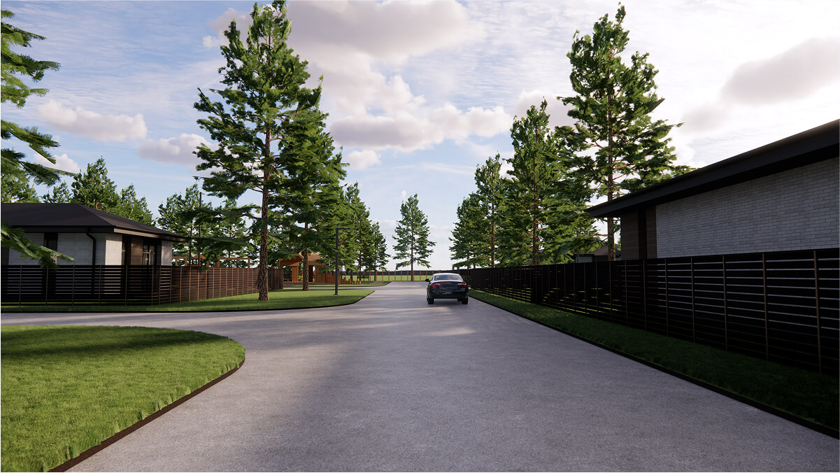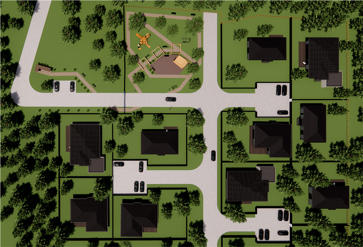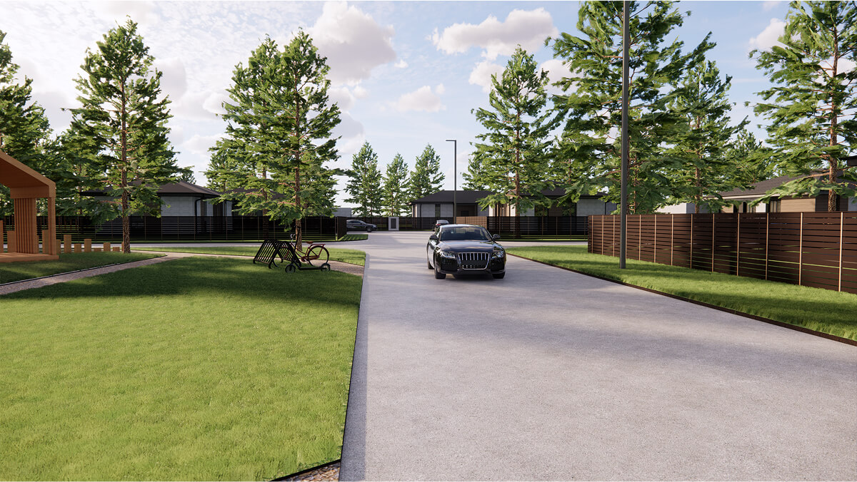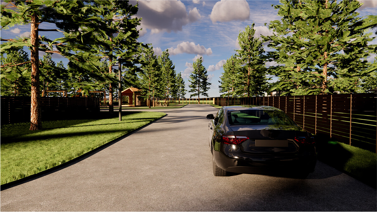 Через поселок проходит асфальтированная центральная улица, с ответвлением на кулуарные улицы. Это создает дополнительный комфорт, снижая скорость движения по поселку и наличие парковочных мест для всех участков.